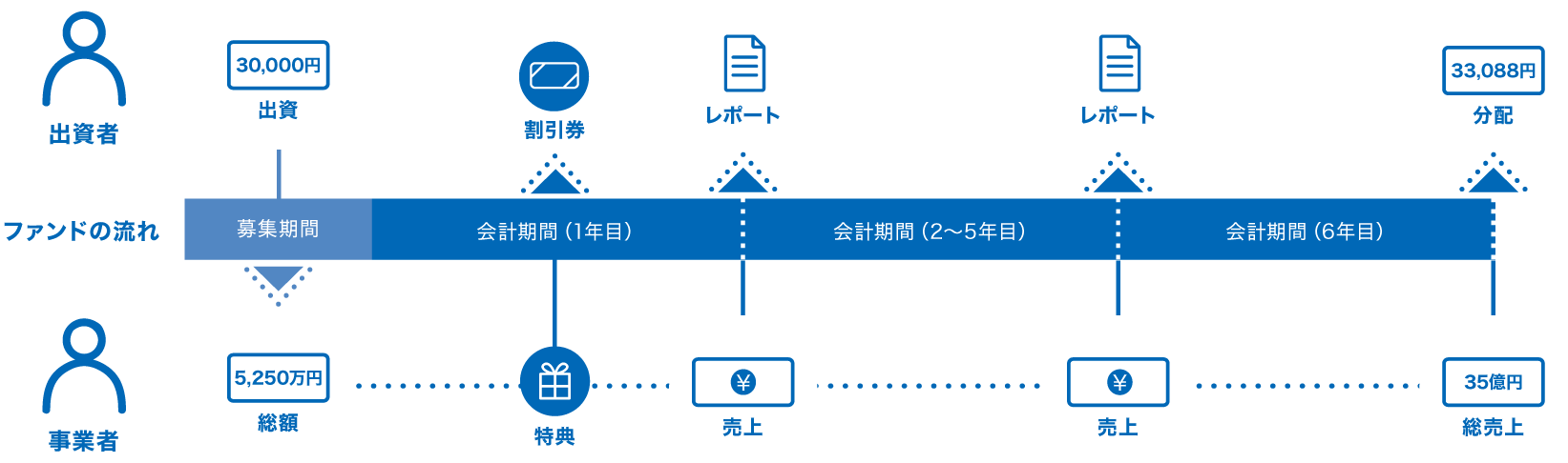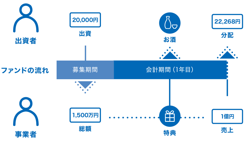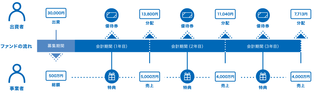 例えば、3万円の出資に対して、期間中毎年、事業売上の一部が分配されます。分配されたトータルの金額が、出資した3万円を超せば利益が出て、下回れば元本割れになります。分配の仕組みについては、別途説明ページをご覧ください。
