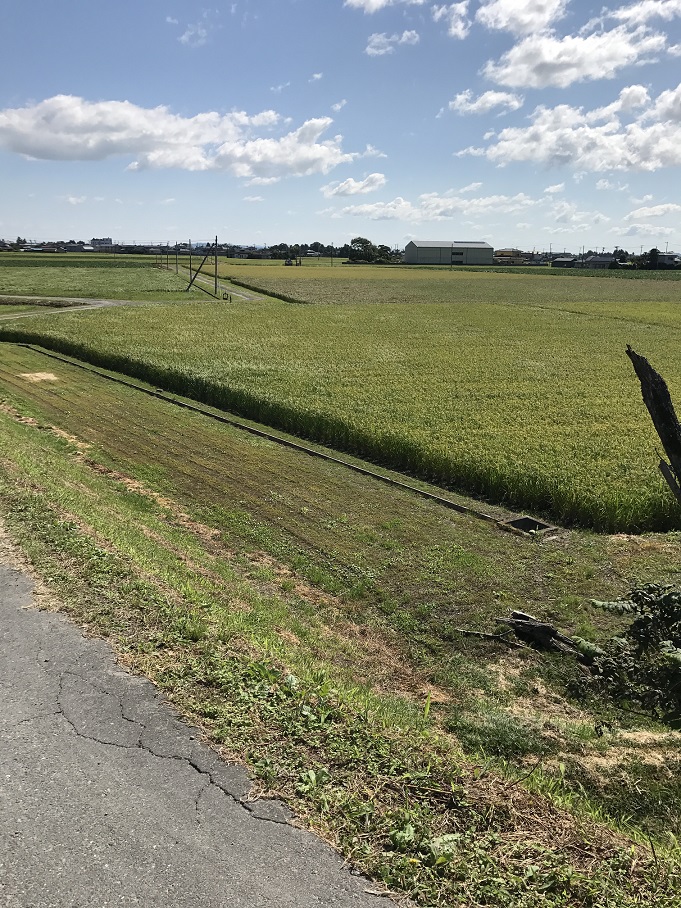 蔵へ降りる堤防からの様子です。右中の田んぼの少し色が違うところは「愛国」です。