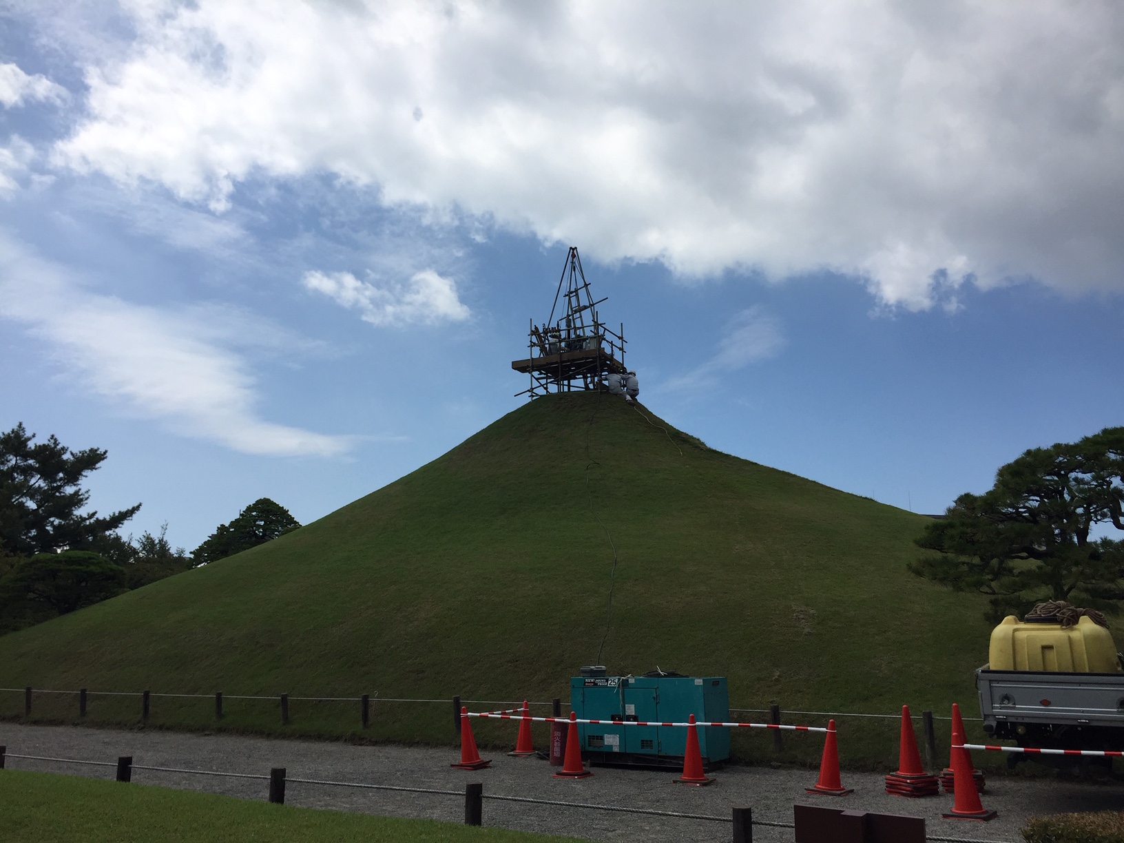 築山と呼ばれる富士山をイメージしてあるところは、熊本地震による被害を受けて地震前と比べて頂上で約60㎝の陥没が確認され、多くの亀裂が入ってしまっているそうです。
