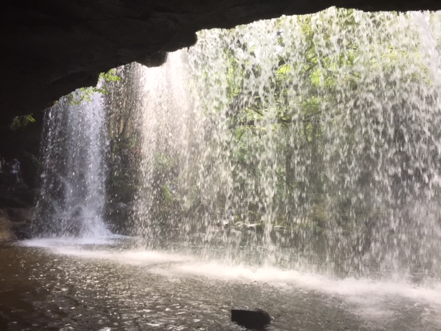 裏から見る滝は表から見たときと違った魅力があります。鍋ケ滝の滝裏の空間は長い年月かけて岩石下の柔らかい地層が水に削られて生まれたものです。この滝裏の空間がとても広いことが鍋ケ滝の特徴です。また、滝の裏側を対岸まで歩いていくことができるため、「裏見の滝」とも呼ばれているそうです。