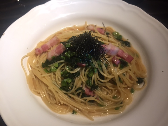 自家製の新漬け阿蘇高菜と薫り高いベーコンを使った和風パスタで、パスタに高菜とベーコンとバター醤油がよく絡んでいて、香りも味も最高でした。