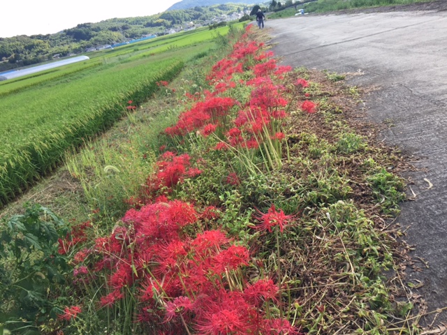 本来なら、川沿いに咲いている彼岸花を数㎞一気に見ることができるのですが、地震の影響で通れない所も少しあります。