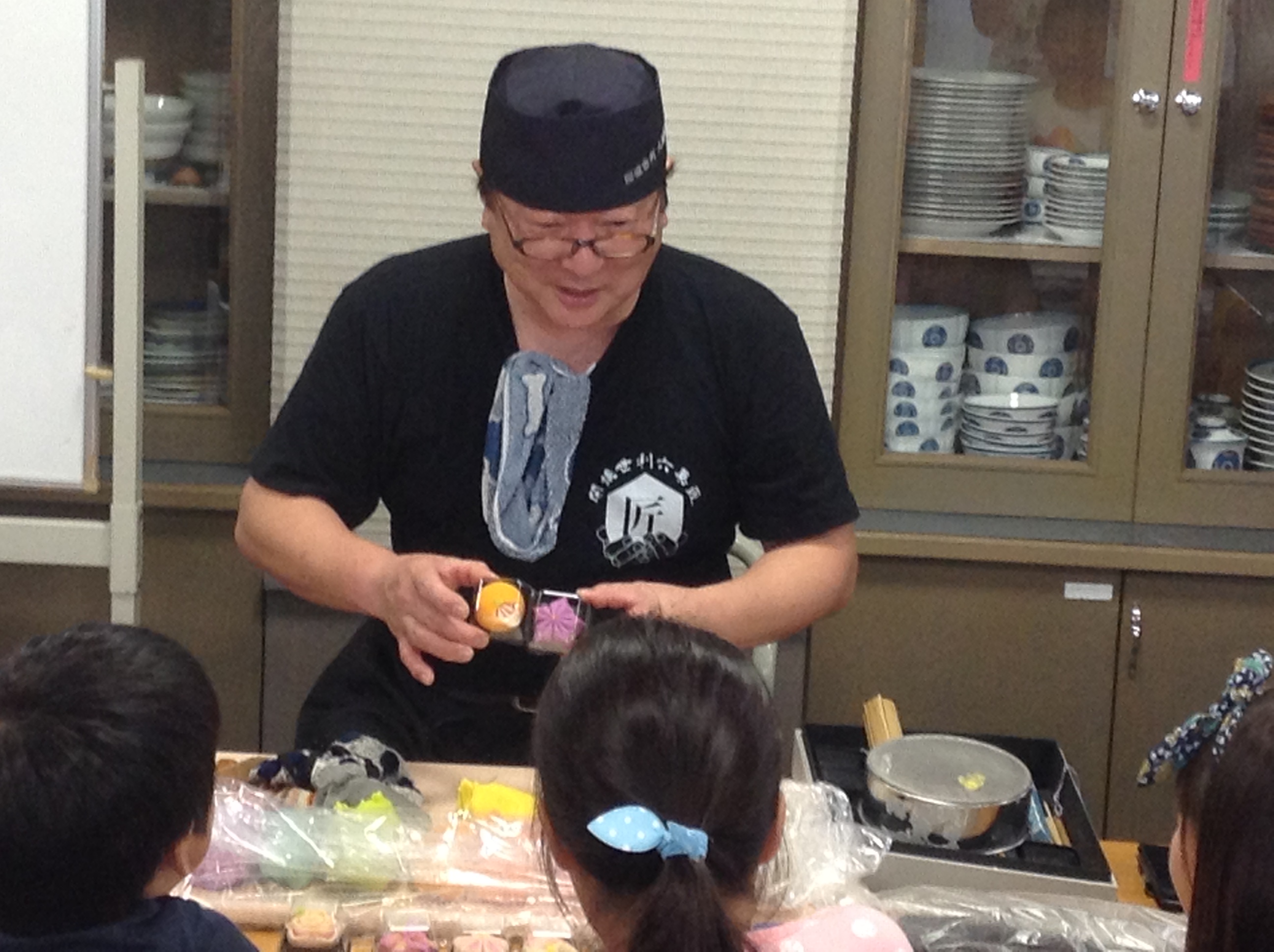 写真は先月行われた「お菓子ふれあい絵巻」の和菓子教室で「菓舗梅園」の社長、片岡さんと片岡さんの息子さんが和菓子の実演を行っているところです。緒方李華 -