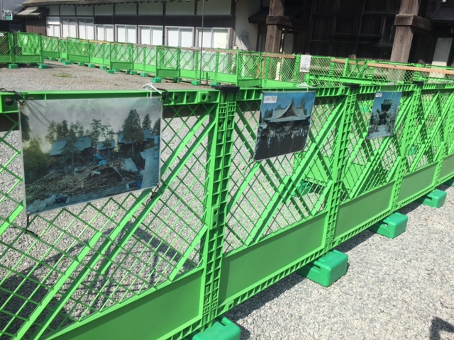 拝殿側はこのように仕切りがあって立ち入り禁止となっています。仕切りには地震前の楼門や拝殿の姿、地震直後の神社の様子が分かる写真が貼ってあり、地震による被害が大きかったことが伝わります。