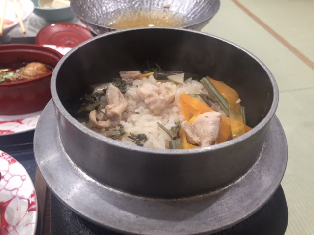 2日目は炊き込みご飯も。食事会場に着いてから火をつけていただくため、熱々のご飯が食べられます。