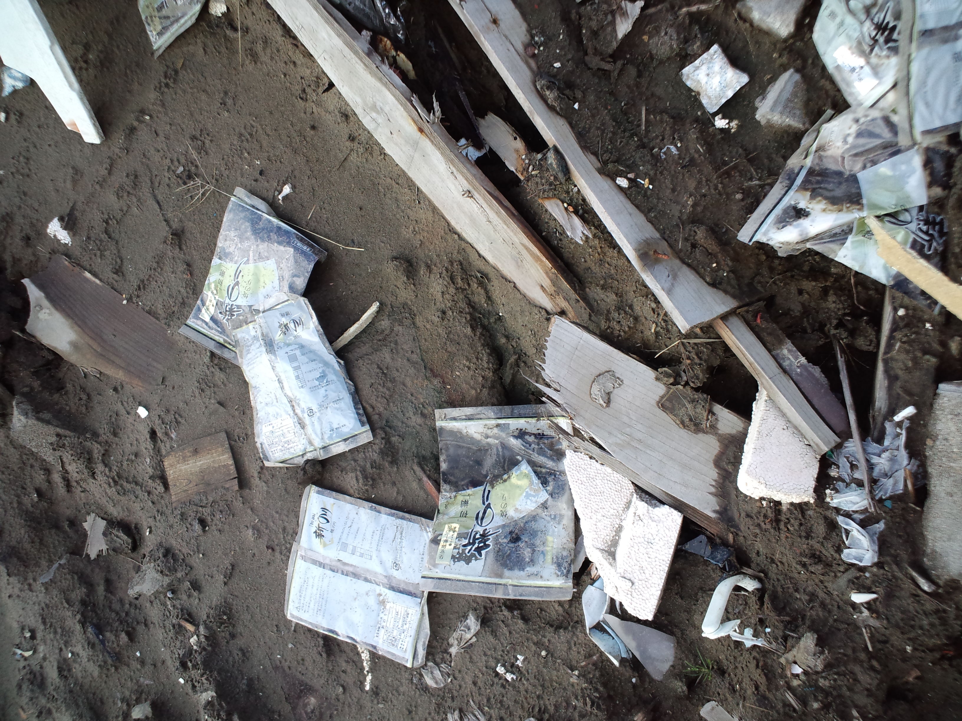 9ヶ月が過ぎた大曲浜の様子は、やっと以前家が建っていた我が家の前まで車で行けるようになっただけです。何も無くなったはずなのに、焼き海苔が何袋かありました。家が基礎ごと無いのに不思議ですね。涙が流れました。