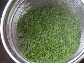 水揚げされためかぶを一つ一つ選別して細かく刻まれていきます。刻まれためかぶを湯通しするとこのように変化していきます。