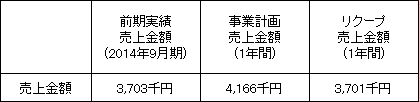 事業計画上の本匿名組合契約会計期間(1年間)における対象銘柄の累計売上金額(税抜)は4,166千円であり、本匿名組合における累計リクープ売上金額(税抜)は3,701千円です。なお、営業者の前期(2014年9月期)の対象銘柄の売上金額(税抜)は3,703千円です。