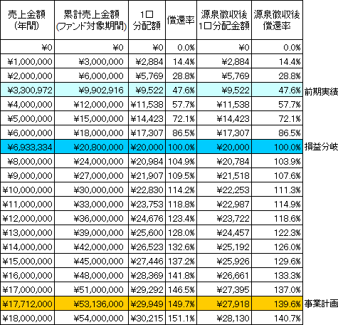 本匿名組合契約における金銭による分配金額のシミュレーションは以下のとおりです。なお、シミュレーションの目的は、本匿名組合事業の売上に応じた分配金額を予想することにあります。したがって、売上を保証するものではなく、匿名組合員に対し、分配金額を保証するものでもありません。