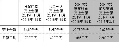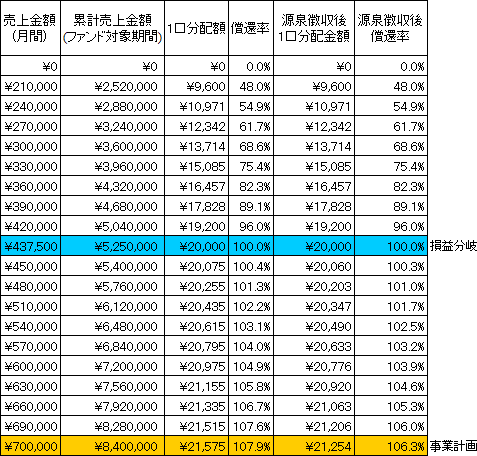 本匿名組合契約会計期間における分配対象となる売上金額(税抜)は8,400千円であり、本匿名組合契約における累計リクープ売上金額(税抜)は5,250千円です。なお、営業者の自己資金で製造する製品も合わせた事業計画全体の売上金額は22,750千円です。