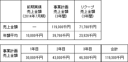 事業計画上の本匿名組合契約会計期間(3年間)の累計売上金額(税抜)は119,300千円(年平均売上金額39,766千円)であり、本匿名組合における累計リクープ売上金額(税抜)は71,780千円(年平均売上金額23,926千円)です。なお、営業者の前期(2014年7月期)の食品事業の売上金額(税抜)は約10,000千円です。