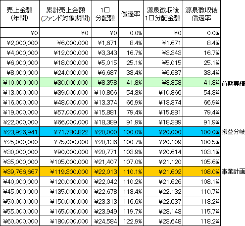 本匿名組合契約における金銭による分配金額のシミュレーションは以下のとおりです。なお、シミュレーションの目的は、本匿名組合事業の売上に応じた分配金額を予想することにあります。したがって、売上を保証するものではなく、匿名組合員に対し、分配金額を保証するものでもありません。