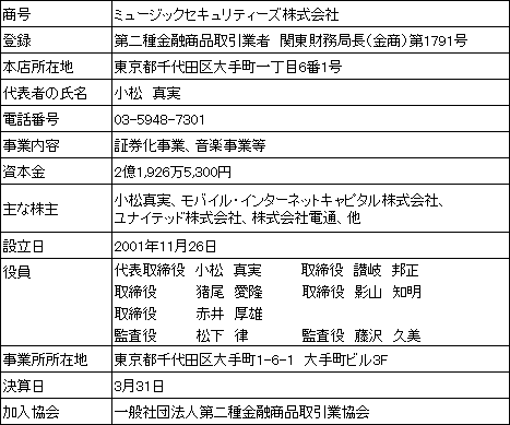 ミュージックセキュリティーズ株式会社 第二種金融商品取引業者 関東財務局長(金商)第1791号 加入協会:一般社団法人第二種金融商品取引業協会