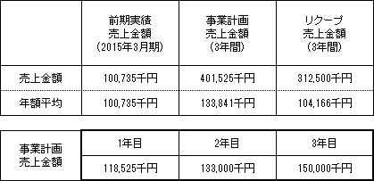 事業計画上の本匿名組合契約会計期間(3年間)の累計売上金額(税抜)は401,525千円(年平均売上金額133,841千円)であり、本匿名組合における累計リクープ売上金額(税抜)は312,500千円(年平均売上金額104,166千円)です。なお、営業者の前期(2014年4月~2015年3月)の売上金額(税抜)は100,735千円です。