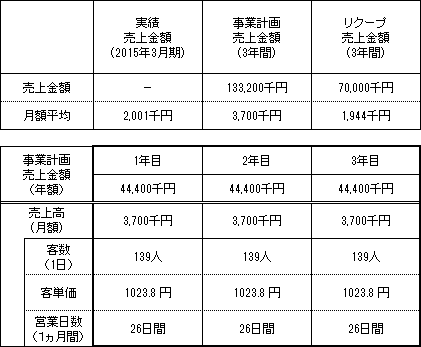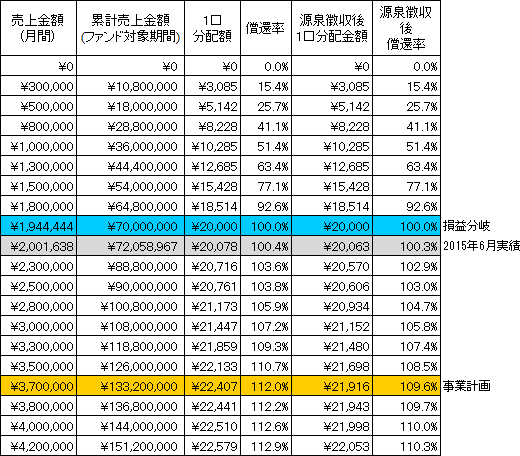 事業計画上の本匿名組合契約会計期間(3年間)の累計売上金額(税抜)は133,200千円(月平均売上金額3,700千円)であり、本匿名組合における累計リクープ売上金額(税抜)は70,000千円(月平均売上金額1,944千円)です。なお、営業者の直前月(2015年6月)の売上金額(税抜)は2,001千円です。