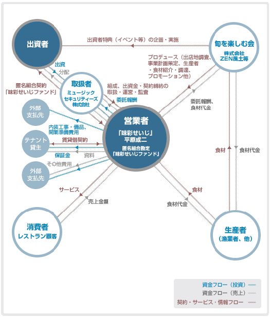 損益の分配及び出資金の返還は、決算日までの飲食店「味彩せいじ」の売上に基づき、当該決算日から60日以後随時、下記の計算方法により行われます。