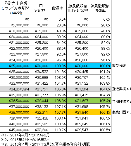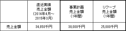 事業計画上の本匿名組合契約会計期間(1年間)の累計売上金額(税抜)は38,000千円であり、本匿名組合における累計リクープ売上金額(税抜)は25,000千円です。なお、営業者の直近(2014年4月~2015年3月)の売上金額(税抜)は34,850千円です。