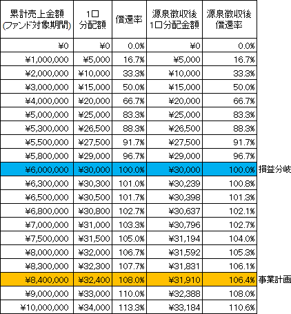 本匿名組合契約における金銭による分配金額のシミュレーションは以下のとおりです。なお、シミュレーションの目的は、本匿名組合事業の売上に応じた分配金額を予想することにあります。したがって、売上を保証するものではなく、匿名組合員に対し、分配金額を保証するものでもありません。