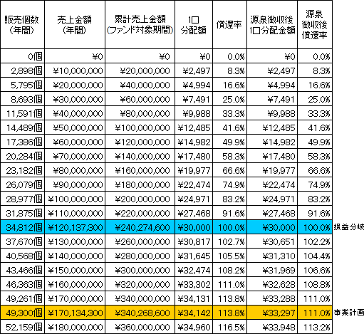 本匿名組合契約における金銭による分配金額のシミュレーションは以下のとおりです。なお、シミュレーションの目的は、本匿名組合事業の売上に応じた分配金額を予想することにあります。したがって、売上を保証するものではなく、匿名組合員に対し、分配金額を保証するものでもありません。