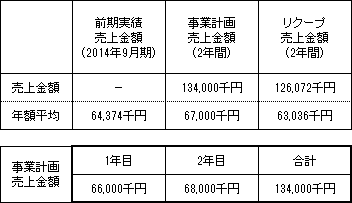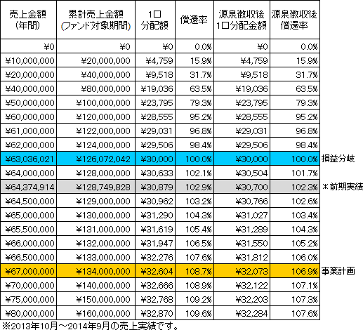 事業計画上の本匿名組合契約会計期間(2年間)の累計売上金額(税抜)は134,000千円(年平均売上金額67,000千円)であり、本匿名組合における累計リクープ売上金額(税抜)は126,072千円(年平均売上金額63,036千円)です。なお、営業者の前期(2013年10月~2014年9月)の売上金額(税抜)は64,374千円です。