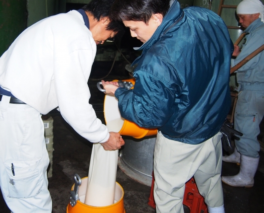 こちらの写真は、大吟醸のもろみを袋の中に注ぎ入れている作業の場面です。