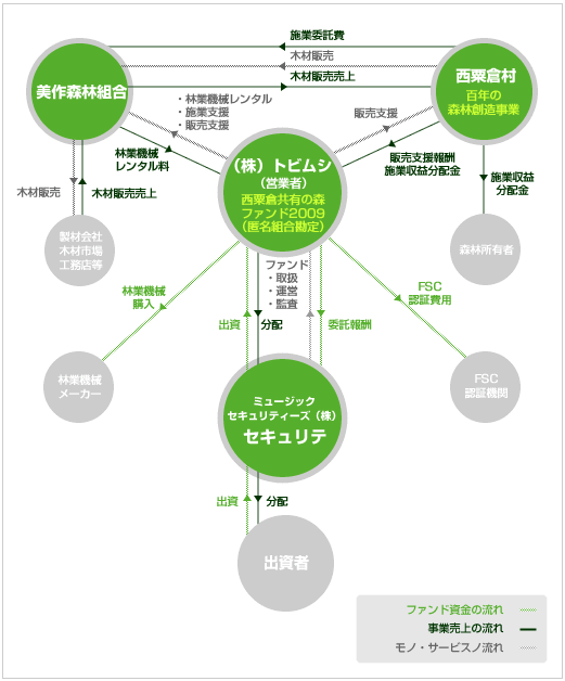 注1:美作森林組合は、本件管理対象森林における施業及び補助金等収入から(株)トビムシへのレンタル料金を支払います。よって、何らかの事由により機械レンタルが継続できない場合、および補助金等が大幅に削減された場合などには当該収入は大きく減少する可能性があります。詳細については、上記「このファンドを申し込む」のボタンをクリックし、「匿名組合契約説明書」をご確認下さい。
