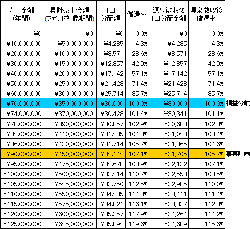 本匿名組合契約における金銭による分配金額のシミュレーションは以下のとおりです。なお、シミュレーションの目的は、本匿名組合事業の売上に応じた分配金額を予想することにあります。したがって、売上を保証するものではなく、匿名組合員に対し、分配金額を保証するものでもありません。