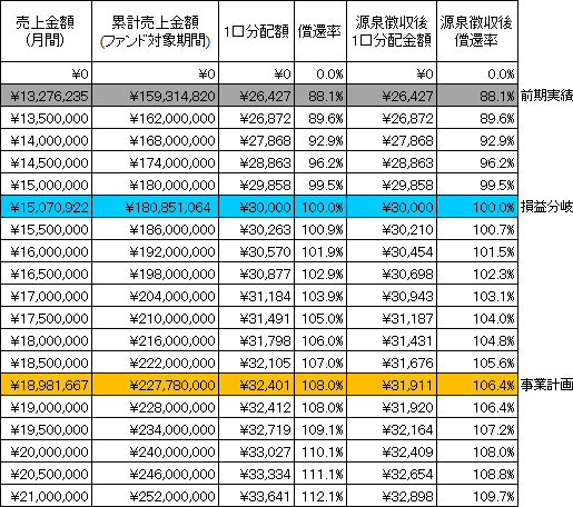 事業計画上の本匿名組合契約会計期間(1年間)の累計売上金額(税抜)は227,778千円(月平均売上金額18,981千円)であり、本匿名組合における累計リクープ売上金額(税抜)は180,851千円(月平均売上金額15,071千円)です。なお、営業者の前期(2014年1月~2014年12月)の売上金額(税抜)は159,314千円です。