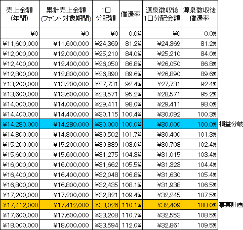 本匿名組合契約における金銭による分配金額のシミュレーションは以下のとおりです。なお、シミュレーションの目的は、本匿名組合事業の売上に応じた分配金額を予想することにあります。したがって、売上を保証するものではなく、匿名組合員に対し、分配金額を保証するものでもありません。