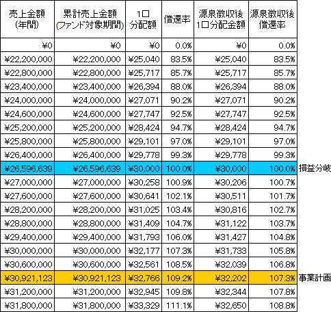 本匿名組合契約における金銭による分配金額のシミュレーションは以下のとおりです。なお、シミュレーションの目的は、本匿名組合事業の売上に応じた分配金額を予想することにあります。したがって、売上を保証するものではなく、匿名組合員に対し、分配金額を保証するものでもありません。