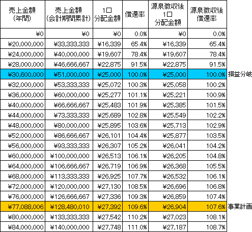 事業計画上の本匿名組合契約会計期間の累計売上金額(税抜)は128,480千円(年平均売上金額77,088千円)であり、本匿名組合における累計リクープ売上金額(税抜)は51,000千円(年平均売上金額30,600千円)です。