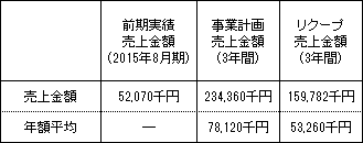 事業計画上の本匿名組合契約会計期間(3年間)の累計売上金額(税抜)は234,360千円(年平均売上金額78,120千円)であり、本匿名組合における累計リクープ売上金額(税抜)は159,782千円(年平均売上金額53,260千円)です。なお、営業者の前期(2014年9月~2015年8月)の売上金額(税抜)は52,070千円です。