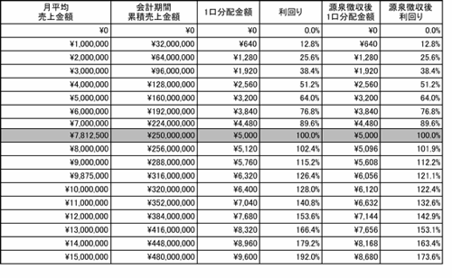 本匿名組合契約における分配金額のシミュレーションは以下のとおりです。なお、シミュレーションの目的は、本匿名組合事業の売上に応じた分配金額を予想することにあります。したがって、売上を保証するものではなく、匿名組合員に対し、分配金額を保証するものでもありません。