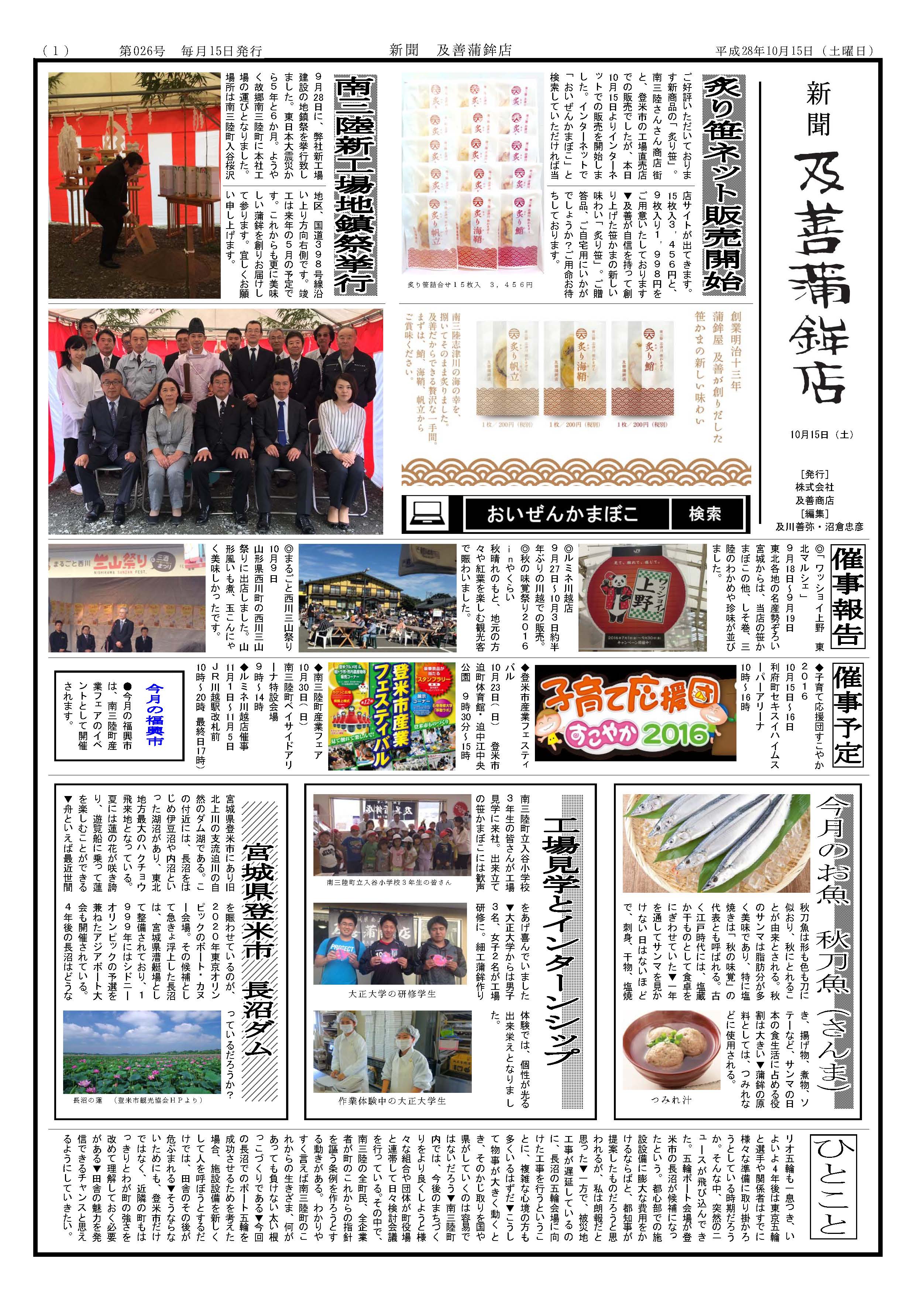 | 創業明治13年、六代続くかまぼこ屋です。笹かまぼこ、伝承の細工かまぼこ、カステラかまぼこなど、当社独自の技法でほとんどの商品は1品1品職人によって作り上げてきました。 特に、笹かまぼこ『リアスの秘伝』は、商品開発初年度の平成5年、『第46回全国蒲鉾品評会農林水産大臣賞受賞』の商品です。伝承の味の継承と伝統の味を探求しながら日々取り組んで参りました。 ウェブサイト:http://www.oizen.co.jp/ | ![]() |