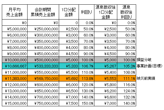 本匿名組合契約における分配金額のシミュレーションは以下のとおりです。なお、シミュレーションの目的は、本匿名組合事業の売上に応じた分配金額を予想することにあります。したがって、売上を保証するものではなく、匿名組合員に対し、分配金額を保証するものでもありません。