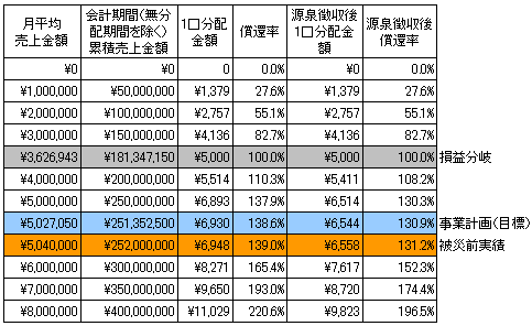 本匿名組合契約における分配金額のシミュレーションは以下のとおりです。なお、シミュレーションの目的は、本匿名組合事業の売上に応じた分配金額を予想することにあります。したがって、売上を保証するものではなく、匿名組合員に対し、分配金額を保証するものでもありません。