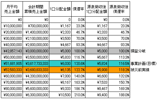 本匿名組合契約における分配金額のシミュレーションは以下のとおりです。なお、シミュレーションの目的は、本匿名組合事業の売上に応じた分配金額を予想することにあります。したがって、売上を保証するものではなく、匿名組合員に対し、分配金額を保証するものでもありません。