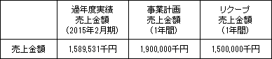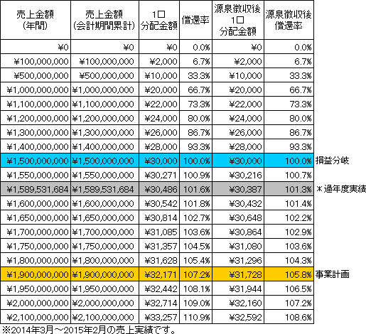 事業計画上の本匿名組合契約会計期間(1年間)の累計売上金額(税抜)は1,900,000千円であり、本匿名組合における累計リクープ売上金額(税抜)は1,500,000千円です。なお、営業者の2期前(2014年3月~2015年2月)の売上金額(税抜)は1,589,531千円です。