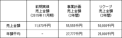 事業計画上の本匿名組合契約会計期間(2年間)の累計売上金額(税抜)は55,555千円(年平均売上金額27,777千円)であり、本匿名組合における累計リクープ売上金額(税抜)は50,000千円(年平均売上金額25,000千円)です。なお、営業者の前期(2014年12月~2015年11月)の売上金額(税抜)は11,873千円です。