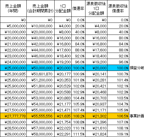 本匿名組合契約における金銭による分配金額のシミュレーションは以下のとおりです。なお、シミュレーションの目的は、本匿名組合事業の売上に応じた分配金額を予想することにあります。したがって、売上を保証するものではなく、匿名組合員に対し、分配金額を保証するものでもありません。
