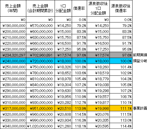 本匿名組合契約における金銭による分配金額のシミュレーションは以下のとおりです。なお、シミュレーションの目的は、本匿名組合事業の売上に応じた分配金額を予想することにあります。したがって、売上を保証するものではなく、匿名組合員に対し、分配金額を保証するものでもありません。