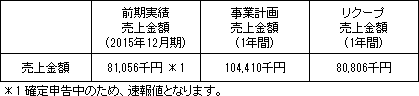 事業計画上の本匿名組合契約会計期間(1年間)の累計売上金額(税抜)は104,410千円であり、本匿名組合における累計リクープ売上金額(税抜)は80,806千円です。なお、営業者の前期(2015年1月~2015年12月)の売上金額(税抜)は81,056千円です。
