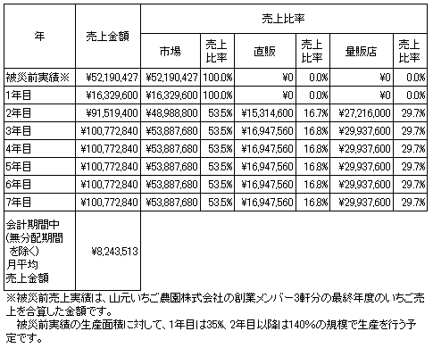 直販につきましては、いちご狩りのために訪問されたお客様を対象に店頭で販売を行う方法により実施する予定でおります。また、WEBサイト・電話・FAXを活用した通信販売も開始する予定でおります。いちご狩りのお客様の集客につきましては、被災後復興1年目の被災地であることの注目度を活用してメディアへの露出を図るとともに、被災地支援をしていただいた方々との関係性を大切にしながら、一度お越しいただいたお客様にリピーターとなっていただけるような美味しい完熟いちごをご提供できるよう努めることによって行ってまいりたいと考えております。量販につきましては、主に生協・スーパー等を対象にして、営業交渉を実施していく予定でおります。
