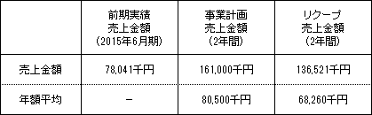 事業計画上の本匿名組合契約会計期間(2年間)の累計売上金額(税抜)は161,000千円(年平均売上金額80,500千円)であり、本匿名組合における累計リクープ売上金額(税抜)は136,521千円(年平均売上金額68,260千円)です。なお、営業者の前期(2014年7月~2015年6月)の売上金額(税抜)は78,041千円です。
