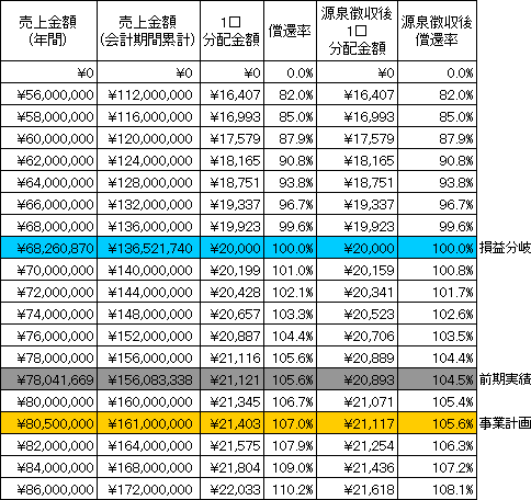 本匿名組合契約における金銭による分配金額のシミュレーションは以下のとおりです。なお、シミュレーションの目的は、本匿名組合事業の売上に応じた分配金額を予想することにあります。したがって、売上を保証するものではなく、匿名組合員に対し、分配金額を保証するものでもありません。
