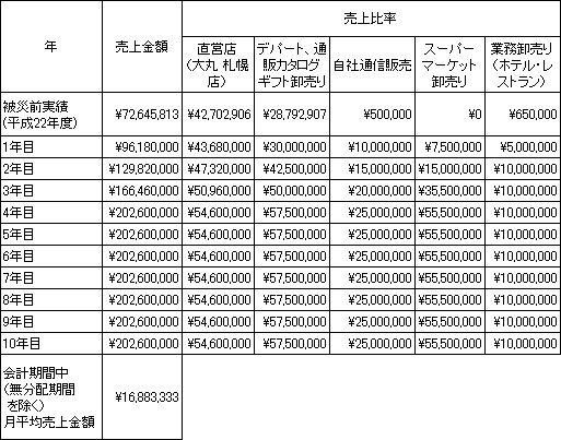 過去に取引のあった大手高級スーパーマーケット15店舗での売上15,000,000円/年の実績を元に、まずは2012年度には既に取引の確定している大手高級スーパーマーケット15店舗にて、各年間500,000円(合計7,500,000円)の売上を目指し、2015年には取引スーパーマーケット数を拡大すると共に、50店舗で1,000,000円/月、10店舗で500,000円の売上をめざします。