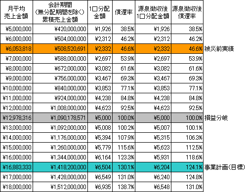 本匿名組合契約における分配金額のシミュレーションは以下のとおりです。なお、シミュレーションの目的は、本匿名組合事業の売上に応じた分配金額を予想することにあります。したがって、売上を保証するものではなく、匿名組合員に対し、分配金額を保証するものでもありません。
