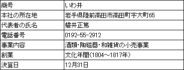 | 当店は、文化年間(1804~1817年)に、当地における飾り職(金属製のかんざし・帯留め・指輪など金具の細工をする職業)として創業いたしました。その後明治年間には酒造業を、また、太平洋戦争中には酒販業も取り扱うようになりました。さらに、昭和30年代以降には陶磁器類を、また、平成に入ってからは布製品や和雑貨もその取扱品目に加え、現在は器・和雑貨・地酒「酔仙」が取扱品目の柱となっております。また、ここ数年においては、地元を始め全国の職人さん・作家さんの作品も大きなウェイトを占める商品となっております。 平成10年代においては、人口の減少、ディスカウントストア・ホームセンター・コンビニエンスストアなどの新業態の参入および大型店の進出という流れの中、当店の売上は最盛期の65%にまで落ち込み困窮しておりました。 そのような中、商業コンサルタントである高橋幸司先生のご指導を仰ぎ、「チラシに負けない店づくり」を目標に商売していく方針を採用いたしました。すなわち、チラシを吟味して作り込み、チラシを見てご来店下さったお客様に「来てよかった」と満足していただけるよう、店においてもスタッフ自身においてもお客様に満足いただけるような店づくりをするということです。当店は震災の日に至るまでのおよそ5年にわたり、このような方針を実践いたしました。その結果、古くからのお得意様に加え、新規のお客様、市外からのお客様、若いお客様が増え、売上も最盛期の80%程度まで回復して来ておりました。笑顔でお買い物をして下さるお客様が増え、ようやく当店の営業方針に自信と確信が持てるようになり、嬉しい限りでしたが、そのような矢先の被災でした。 震災後再開した仮設店舗においても当店の基本的な考え方に変わりなく、良い品の作り手と暮らしを楽しむ使い手の橋渡しとして、徹底的にお客様に楽しんでいただくことを目標に当店の営業を継続してまいりたいと思っております。 ※営業者ウェブサイト:http://www.i-wa-i.jp/ |