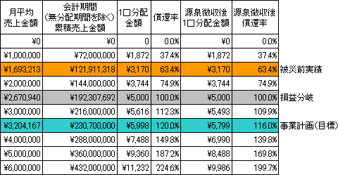本匿名組合契約における分配金額のシミュレーションは以下のとおりです。なお、シミュレーションの目的は、本匿名組合事業の売上に応じた分配金額を予想することにあります。したがって、売上を保証するものではなく、匿名組合員に対し、分配金額を保証するものでもありません。