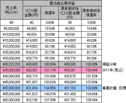 本匿名組合契約における分配金額のシミュレーションは以下のとおりです。なお、シミュレーションの目的は、本匿名組合事業の売上に応じた分配金額を予想することにあります。したがって、売上を保証するものではなく、匿名組合員に対し、分配金額を保証するものでもありません。